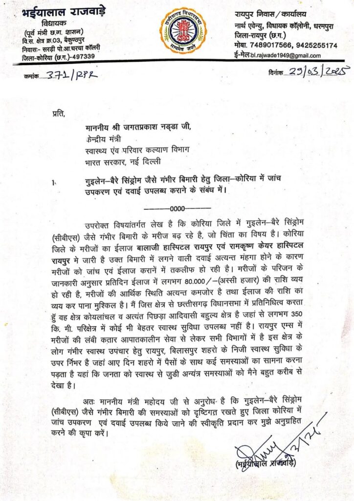 बैकुंठपुर विधायक व पूर्व मंत्री भईयालाल राजवाड़े ने केन्द्रीय मंत्री स्वास्थ्य एंव परिवार कल्याण मंत्री जगतप्रकाश नड्डा को पत्र लिखकर कोरिया जिले में फैली महामारी के सबंध में मांग किया है कि गुइलेन-बैरे सिंड्रोम जैसे गंभीर बिमारी हेतु कोरिया में जांच उपकरण एवं दवाई उपलब्ध कराने की मांग की है। उन्होने कहा कि कोरिया जिले में गुइलेन-बैरे सिंड्रोम (सीबीएस) जैसे गंभीर बिमारी के मरीज बढ़ रहे है, जो चिंता का विषय है।