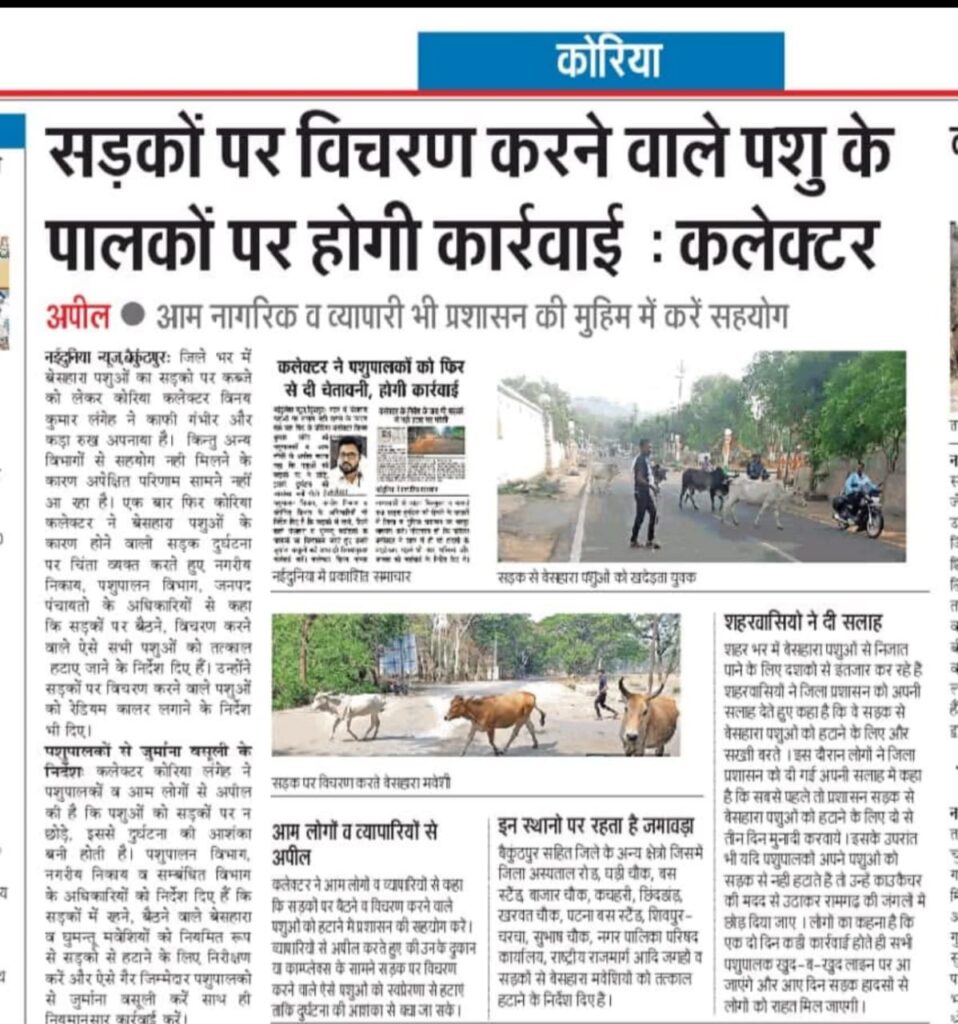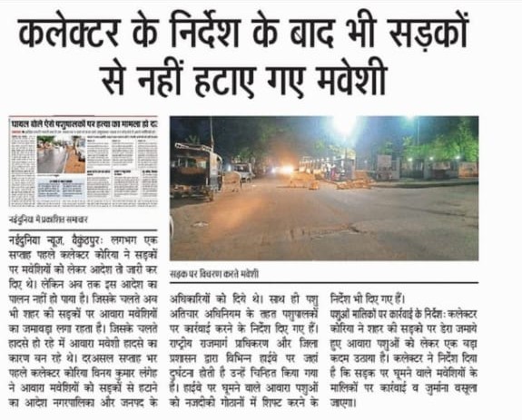 यातायात व्यवस्था बनाने के लिए तत्कालीन कलेक्टर विनय कुमार लंगेह ने मइ् 2024 को बैठक लेकर नगर पालिका व पंचायतो के अधिकारी को आवारा मवेशियों को पकड़ने की कार्रवाई करने के निर्देश दिए थे। कलेक्टर के आदेश का नपा व पंचायत के अधिकारियों ने चार दिन ही पालन किया, जिसमें दर्जन भर मवेशियों को पकड़ा गया। इस दौरान कलेकटर के तबादला होते ही आवारा मवेशियों को पकड़ने की मुहिम दम तोड़ गई। शहर में हर चौक-चौराहों पर आवारा मवेशियों का झुंड देखा जा सकता है।