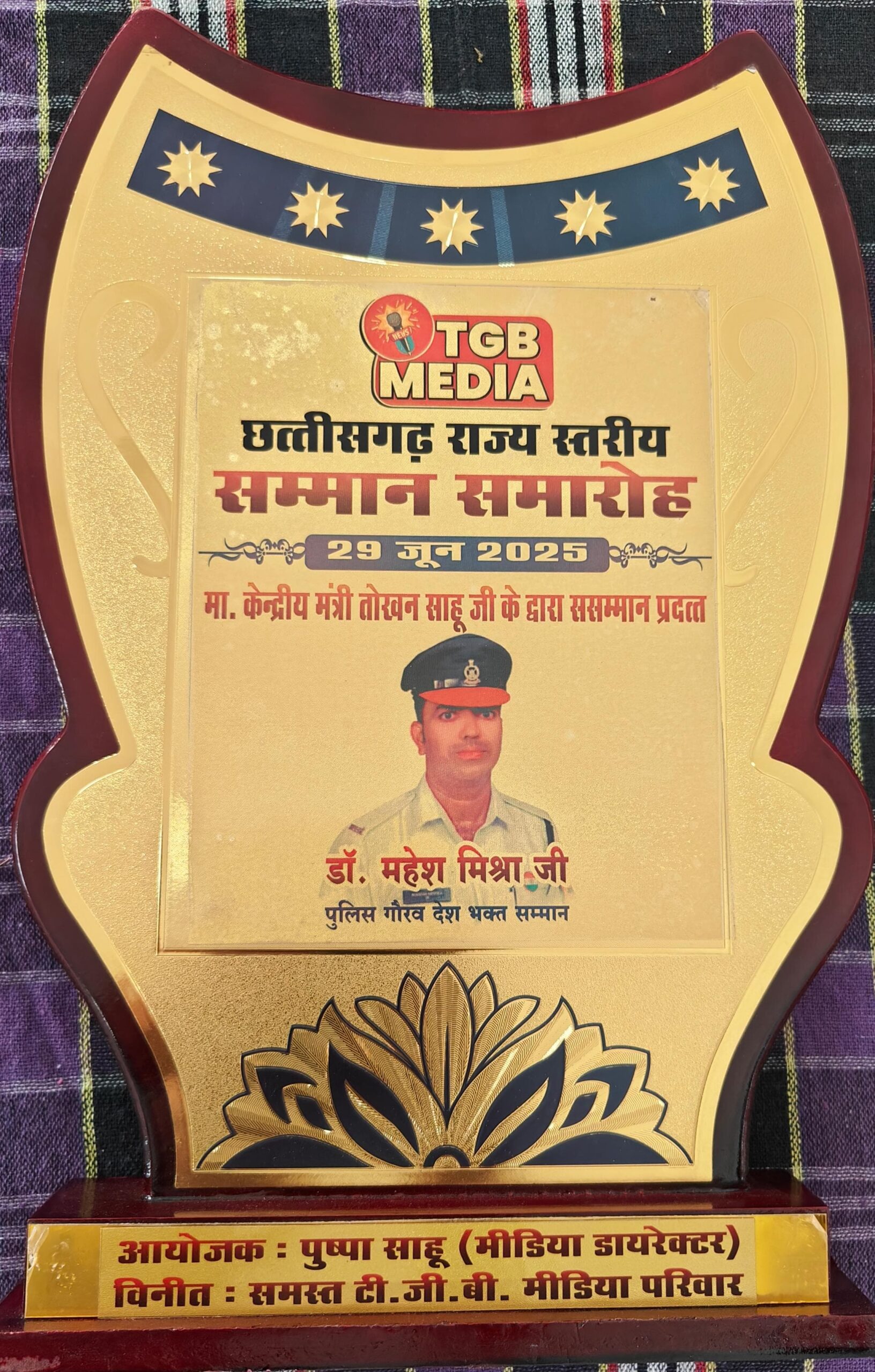 न्यायधानी बिलासपुर में केंद्रीय मंत्री तोखन साहू के हाथों ट्रैफिक मैन महेश मिश्रा को मिला पुलिस गौरव देशभक्त सम्मान