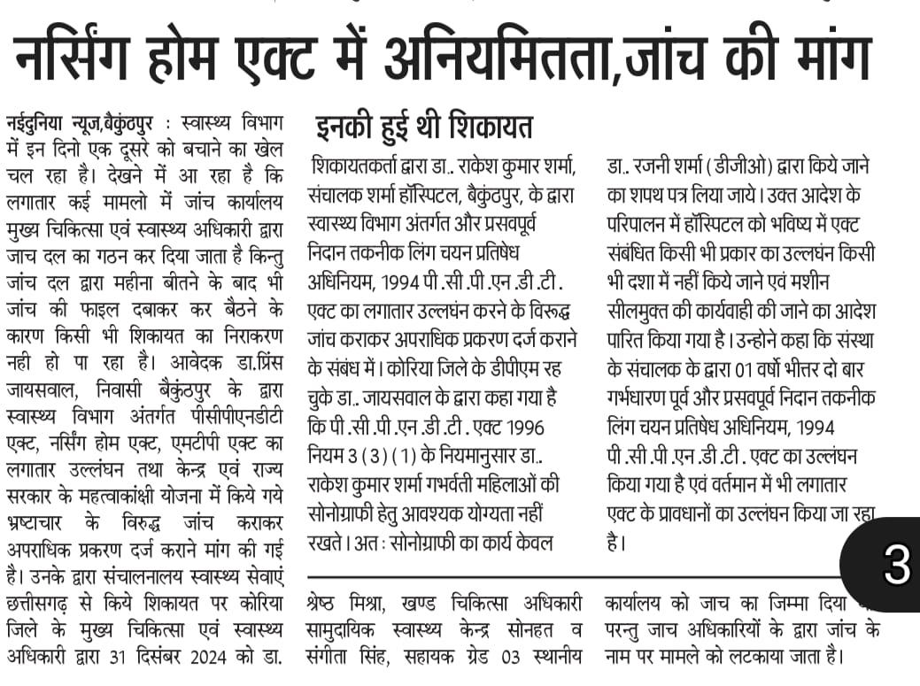 पीसीपीएनडीटी, नर्सिंग होम व एमटीपी एक्ट जाच पूरीअधिकारी बोले जल्द ही होगी कार्यवाई……खबर प्रकाशित होने पर दबाव में आये जॉच अधिकारियो ने सीएचएमओ को सौपा जॉच रिर्पोट