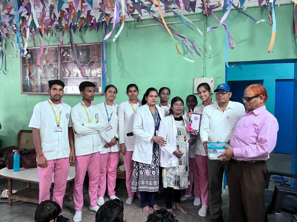 साथ ही प्राचार्य के द्वारा बताया गया की नेत्रहीन बच्चों के द्वारा एंड्रॉएड फोन का उपयोग जॉर्ज एंड्रॉएड एैप के माध्यम से किया जाता है। जिससे संबंधित नेत्रहीन शिक्षण-प्रशिक्षण विद्यालय मनेन्द्रगढ़ में नर्सिंग छात्र-छात्राओं ने नेत्रहीन बालकों को स्वास्थ्य शिक्षा दी गई एवं स्वास्थ्य जांच अन्तर्गत रक्तचाप, वजन, लम्बाई जांच किया गया। बच्चों के उत्साहवर्धन के लिए नर्सिंग के छात्र-छात्राओं ने नेत्रहीन बच्चों के साथ मिलकर गाना गाया, साथ ही नर्सिंग के छात्र-छात्राओं ने देखा की नेत्रहीन बच्चों में विभिन्न प्रकार की कलाएँ होती है जैसे-मुंह से अनेक प्रकार के जानवरों के आवाज निकालना इत्यादि। नर्सिंग के छात्र-छात्राओं द्वारा शारीरिक शिक्षा के रूप में साफ-सफाई से सम्बन्धित नेत्रहीन बच्चों को अवगत कराया गया। कार्यक्रम उपरान्त नर्सिंग के छात्र-छात्राओं द्वारा नेत्रहीन बच्चों को खाद्य सामाग्री का वितरण किया गया एवं धन्यवाद स्वरूप प्राचार्य को फस्ट एड बॉक्स विद्यालय के लिए दिया गया गया।