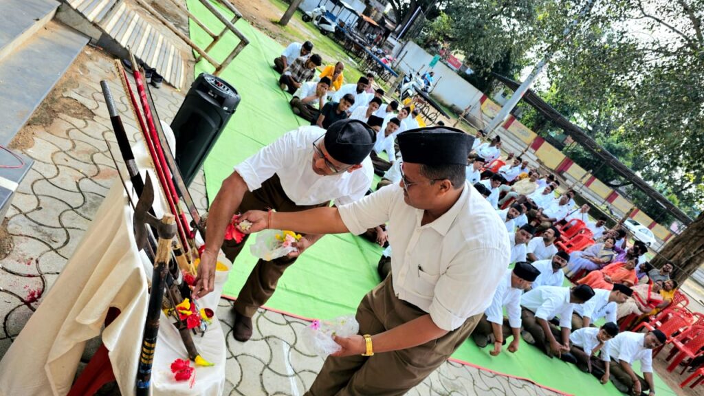 राष्ट्रीय स्वयंसेवक संघ ने बैकुंठपुर में गुरुवार को विजयदशमी उत्सव और शस्त्र पूजन कार्यक्रम का आयोजन किया। यह आयोजन संघ के शताब्दी वर्ष के उपलक्ष्य में किया गया। इसमें स्वयंसेवकों ने उत्साहपूर्वक भाग लिया। कार्यक्रम का नेतृत्व मुख्य वक्ता सिद्ध विनायक पांडे एवं महलपारा बस्ती प्रमुख रवि कांत गुप्ता ने बताया कि हिन्दु समाज में पौरुष तथा शक्ति का जागरण विजयादशमी के पावन पर्व पर होता है। इस पवित्र पर्व पर अपने राष्ट्रीय स्वयंसेवक संघ का कार्य प्रारंभ होकर 100 वर्ष पूर्ण हो रहे है। विश्व शाति और मानव कल्याण का उद्देश्य लेकर सदियों से हिंदु समाज की चल रही प्रदीर्घ यात्रा का ही यह सांप्रत रूप है।