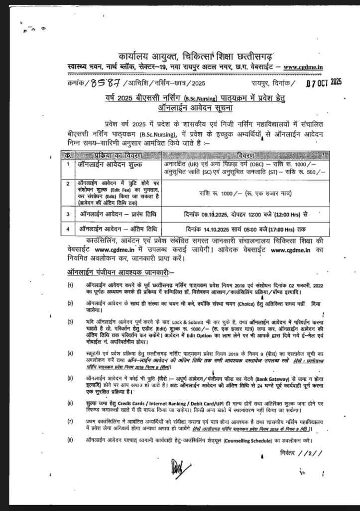 जिला मुख्यालय बैकुंठपुर में संचालित न्यू लाईफ इंस्टीट्यूट आफ नर्सिंग द्वारा बी.एस.सी. नर्सिेग कोर्स हेतु पात्र उम्मीदवारों की आनलाइन आवेदन प्रक्रिया प्रांरभ की गई है। संचालनालय चिकित्सा शिक्षा (डीएमई) के आदेशानुसार 09 से 14 अक्टूबर तक आनलाइन भरी जायेगी। संचालक चिकित्सा शिक्षा छत्तीसगढ के निर्देशानुसार बी.एस.सी. नर्सिेग पाठ्यक्रम में प्रवेश हेतु आनलाइन आवेदन सूचना शैक्षणिक सत्र 2025-26 के लिए, प्रदेश के शासकिय एवं निजी नर्सिंग माहाविद्यालयों में संचालित बी.एस.सी. नर्सिेग पाठ्यक्रम में प्रवेश हेतु व्यापम द्वारा प्रवेश परीक्षा का आयोजन किया गया, जिसके परिणाम भी घोषित हो चुके हैं, जिसकी प्राप्तांक के आधार पर आबंटन किया जायेगा।