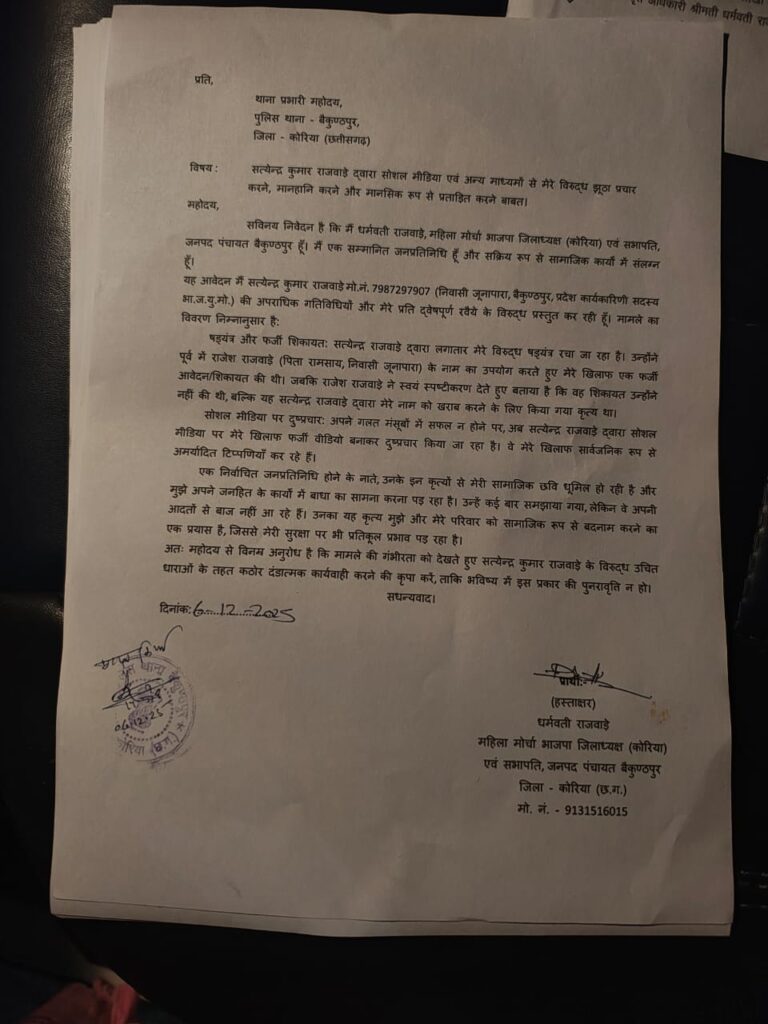 धर्मवती राजवाडे सत्येन्द्र कुमार राजवाडे निवासी जूनापारा, बैकुंठपुर, प्रदेश कार्यकारिणी सदस्य भाजयुमो की अपराधिक गतिविधियों और मेरे प्रति द्वेषपूर्ण रवैये के विरुद्ध प्रस्तुत कर रही हूँ। मामले का विवरण निम्नानुसार है । षड्यंत्र और फर्जी शिकायतः सत्येन्द्र राजवाडे द्वारा लगातार मेरे विरुद्ध षड्यंत्र रचा जा रहा है। उन्होंने पूर्व में राजेश राजवाडे पिता रामसाय, निवासी जूनापारा के नाम का उपयोग करते हुए मेरे खिलाफ एक फर्जी आवेदन/शिकायत की थी। जबकि राजेश राजवाडे ने स्वयं स्पष्टीकरण देते हुए बताया है कि वह शिकायत उन्होंने नहीं की थी, बल्कि यह सत्येन्द्र राजवाडे द्वारा मेरे नाम को खराब करने के लिए किया गया कृत्य था।