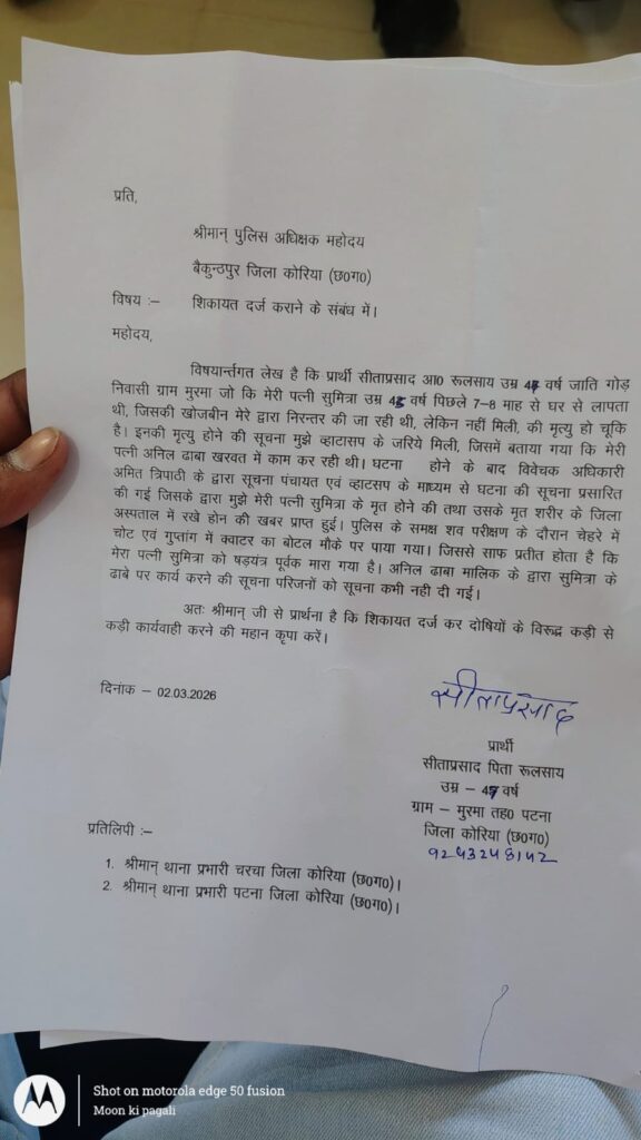 मामले में मृतक के पति सीताप्रसाद पिता रूलसाय उम्र 48 वर्ष जाति गोड़ निवासी ग्राम मुरमा थाना चरचा ने कहा कि मेरी पत्नी सुमित्रा उम्र 45 वर्ष पिछले 7-8 माह से घर से लापता थी, जिसकी खोजबीन मेरे द्वारा निरन्तर की जा रही थी, लेकिन नहीं मिली, की मृत्यु हो चूकि है। गत 26 फरवरी को मौत होने की सूचना मुझे व्हाटासप के जरिये मिली । जिसमें बताया गया कि मेरी पत्नी अनिल ढाबा खरवत में काम कर रही थी। घटना होने के बाद विवेचक अधिकारी के द्वारा सूचना पंचायत एवं व्हाटसप के माध्यम से घटना की सूचना प्रसारित की गई । जिसके द्वारा मुझे मेरी पत्नी सुमित्रा के मृत होने की तथा उसके मृत शरीर के जिला अस्पताल में रखे होने की खबर प्राप्त हुई। पुलिस के समक्ष शव परीक्षण के दौरान चेहरे में चोट एवं गुप्तांग में बोतल मौके पर पाया गया। जिससे साफ प्रतीत होता है कि मेरी पत्नी सुमित्रा को षड़यंत्र पूर्वक मारा गया है। इसलिए ढाबा मालिक के द्वारा सुमित्रा के ढाबे पर कार्य करने की सूचना परिजनों को कभी नहीं दी गई।