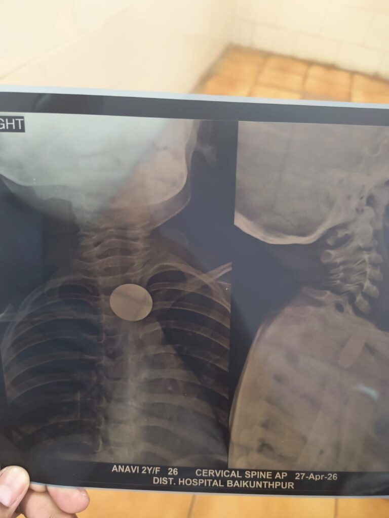 एमसीबी जिले के नागपुर की रहने वाली 2 साल की मासूम बच्ची आनवी खेल-खेल में ही 5रुपए का सिक्का निगल गई। बच्ची जब सोमवार की दोपहर में उल्टी करने लगी तब माता-पिता समेत जब परिजनों इसको लेकर तत्काल बैकुंठपुर के जिला अस्पताल पहुॅचे। जहा पर सिविल सर्जन डॉ. आयुश जायसवाल के नेतृत्व में ईएनटी विशेषज्ञ डॉ. योगेश्वर चौहान ने बच्ची का एक्सरे कराया जहा पर उसके गले में सिक्का फंसे होने की पुष्टि होने के बाद उसके गले में फंसे सिक्के को बाहर निकाल लिया गया है उसकी हालत अब खतरे से बाहर है। बताया गया कि बच्ची को उल्टी हो रही थी गले के संवेदनशील हिस्से में सिक्का फंसा होने के कारण मासूम की स्थिति चौहान अभी तक लगभग एक दर्जन से अधिक बच्चों के गले से सिक्का निकालकर जाने बचा चुके हैं।