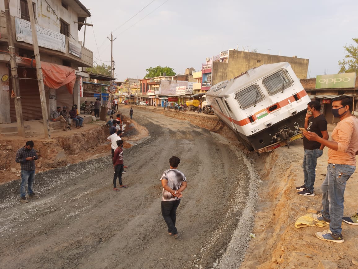 निर्माणाधीन एन एच में फंसा ट्रक में लदा ट्रैन इंजिन का केबिन, आवागमन बाधित